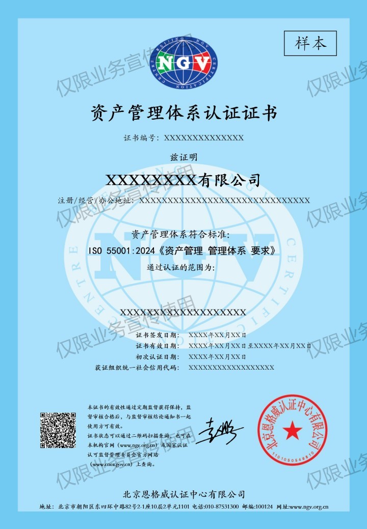 认证依据旧版标准为GB/T 33173—2016/ISO 55001:2014《资产管理 管理体系 要求》,认证依据新版标准为ISO 55001:2024《资产管理 管理体系 要求》