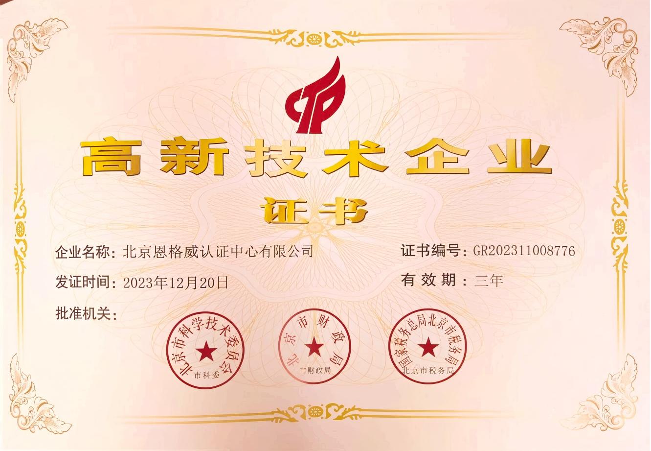 高新技术企业证书