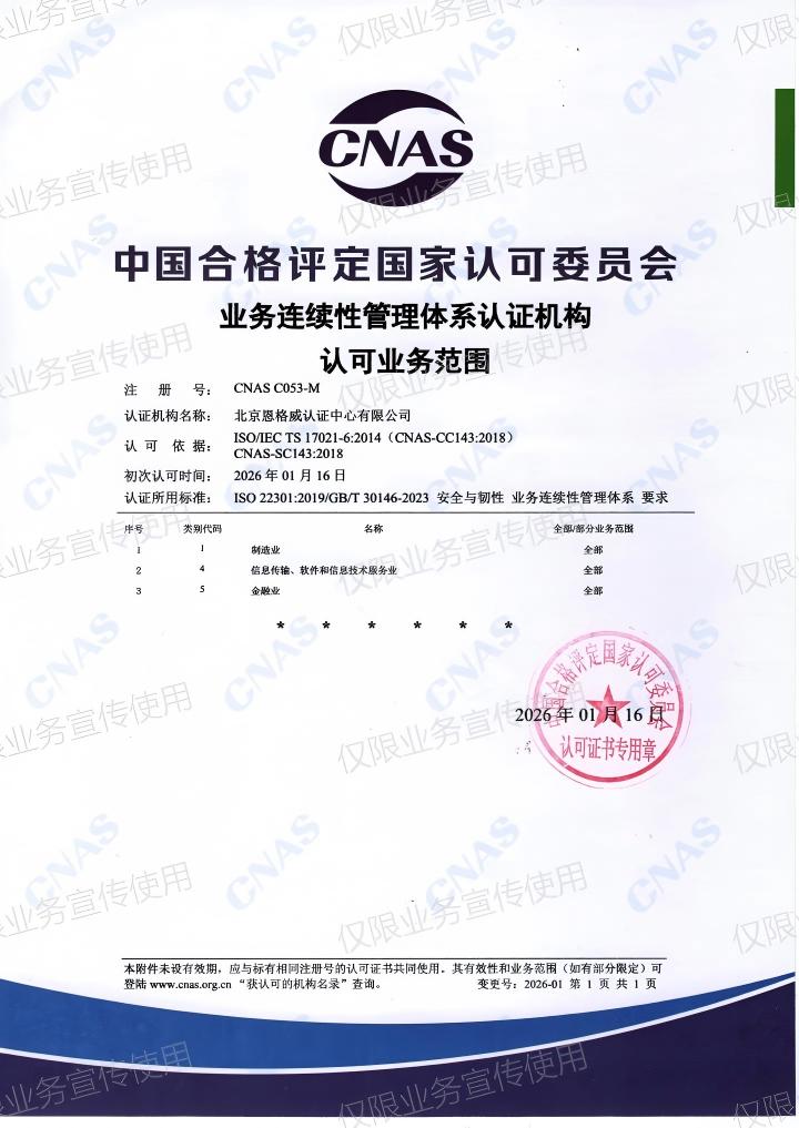 业务连续性管理体系认证机构认可业务范围
