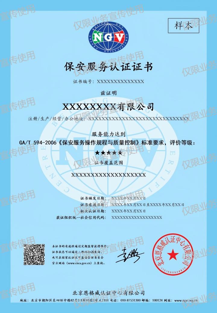 保安服务认证主要依据GA/T594-2006《保安服务操作规程与质量控制》。此标准规定了保安服务具体的操作规程,以及服务质量应达到的基本要求。最终服务认证结果从低到高,分为3个等级,即三星级至五星级。