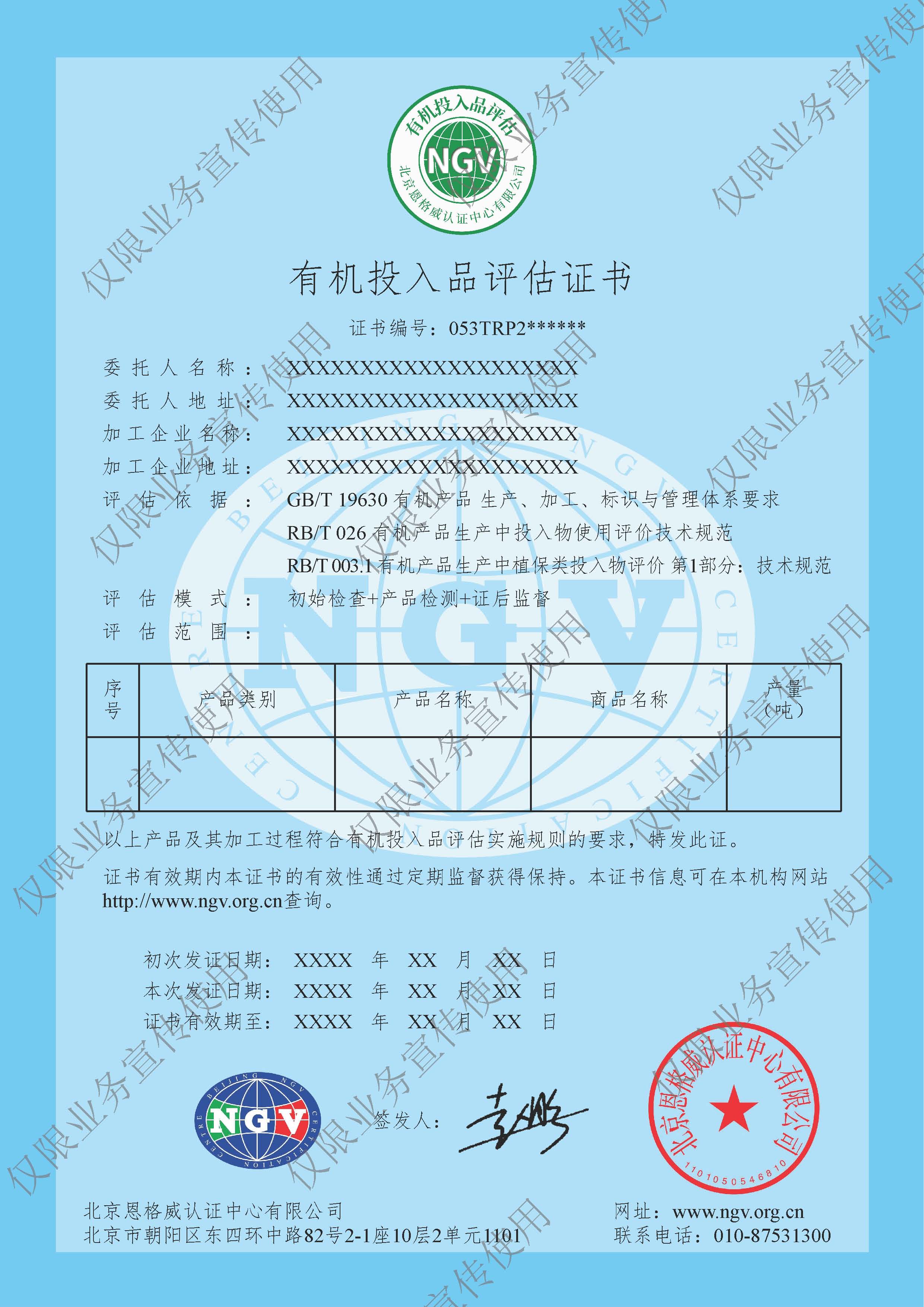 有机投入品指获得国家法定部门许可、登记,符合GB/T19630《有机产品生产、加工、标识与 管理体系要求》附录要求的,并经认证机构评估或者评价的,证明可以用在有机农业生产上的 土壤培肥和改良物质、植物保护产品、动物营养和饲料生产允许使用的投入品、畜禽养殖场所 清洁消毒产品等的投入品。